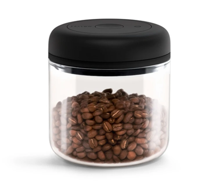 Cette boîte de conservation Atmos de la marque Fellow est en verre borosilicate et en acier inoxydable avec un joint en silicone.