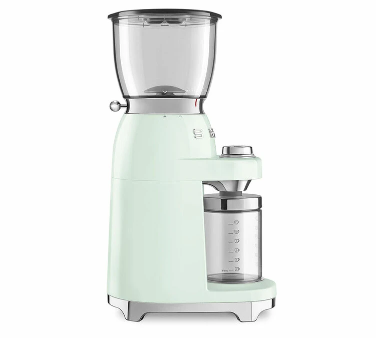 Le SMEG CGF01PGEU vert d’eau est un moulin à café polyvalent, avec un design rétro tout droit des années 50.